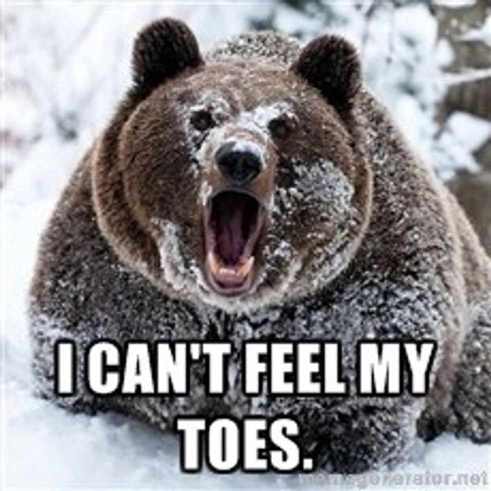"Can't feel my toes or my face. Probably have frostbite. Great, I'm going to be toe-less and faceless when I get home. If I ever get home."