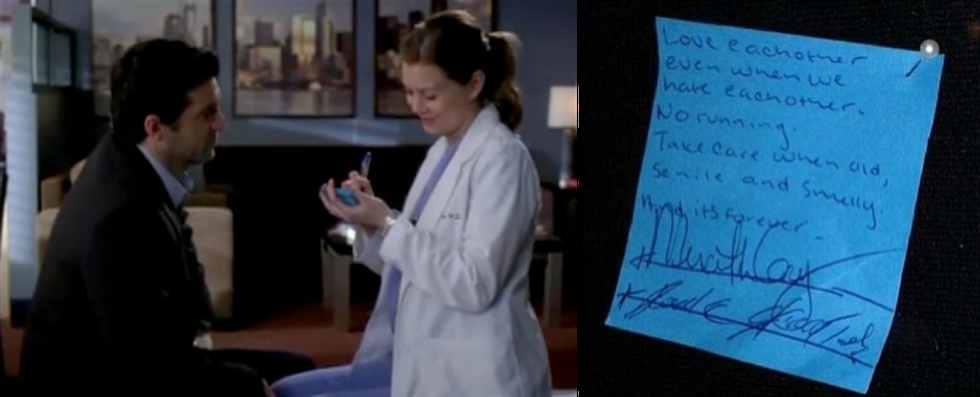 Who else could make you want to get married via a Post-It note? Doubtfully anyone but Derek and Meredith. She doesn’t even need a high-end wedding dress or breath-taking vows to make you envy her wedding. Derek Shepherd vowing to love Meredith for the rest of his life is going to be emotional in any fashion, the framed Post-It note above their bed was just the icing on the cake.