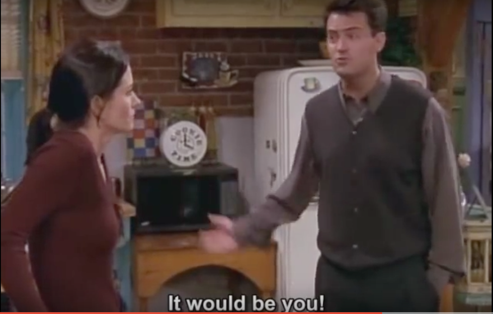 THIS. Everything about this moment makes you swoon (or cry, if you're like me). Chandler and Monica discover they're not able to have children, so they decide to adopt. When the meeting with Erica (who is looking for the perfect future parents for her children) goes awry, Chandler delivers a heartwarming speech about how incredible Monica is as a person. In this moment, it is blatantly obvious how much he loves Monica, and how much he wants her to become a mother. Spoiler alert: Erica decides to let Monica and Chandler adopt her twin babies.