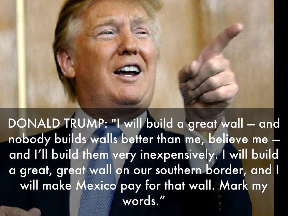 8. "I will build a great wall – and nobody builds walls better than me, believe me —and I'll build them very inexpensively. I will build a great, great wall on our southern border, and I will make Mexico pay for that wall. Mark my words."