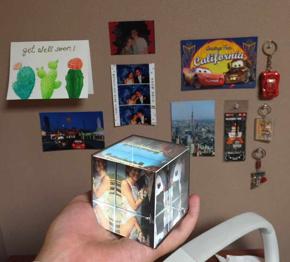 Although you can’t actually be in their room, a picture is always a nice reminder of them. Cute pictures can make lonely rooms seem a lot cheerier! We also like to send some postcards from our college towns, and exchange keychains from where we visit! I also got my boyfriend this cool glass cube frame that fits 3 photos.