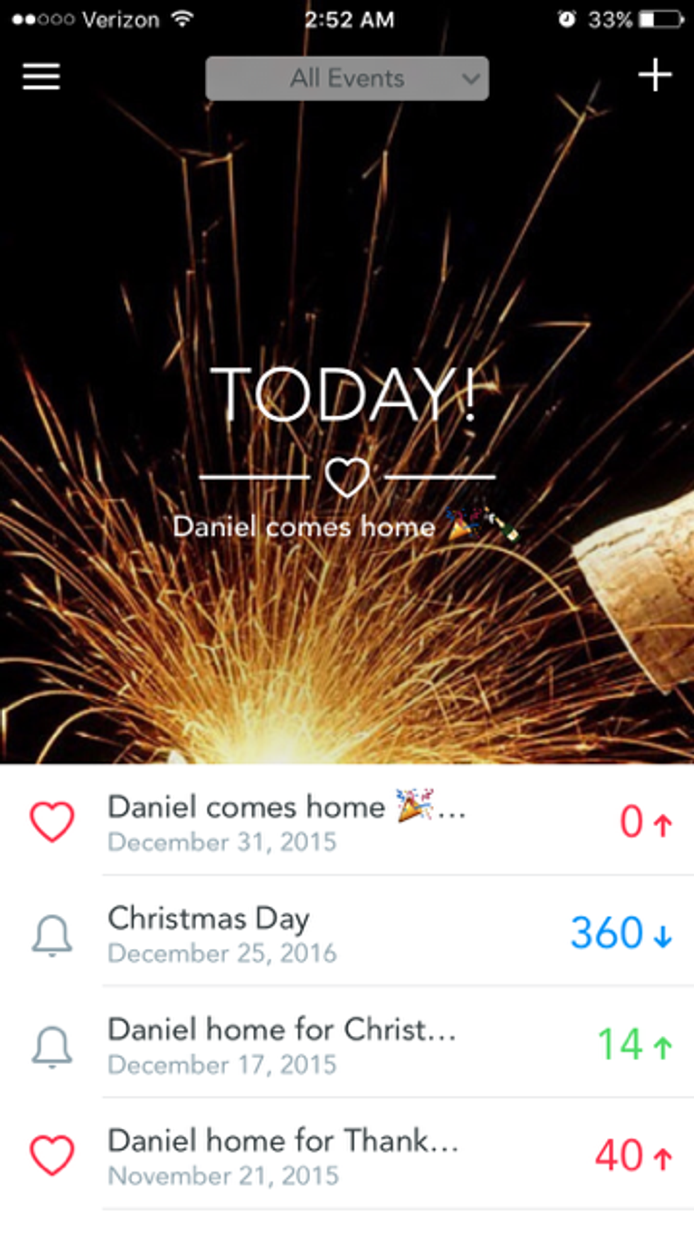A lifesaver for long distance relationships and impatient partners! Knowing when my boyfriend was going to come home made the wait so much easier. When the day of his return grew closer, I would check the app everyday. It gave me something to look forward to, and made the wait seem shorter. I used a free version of the app "Dreamdays." It lets you customize your background image!