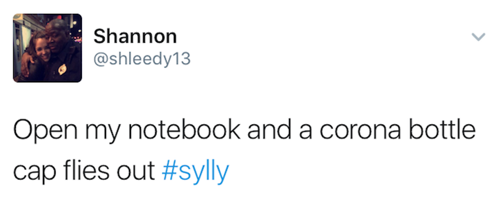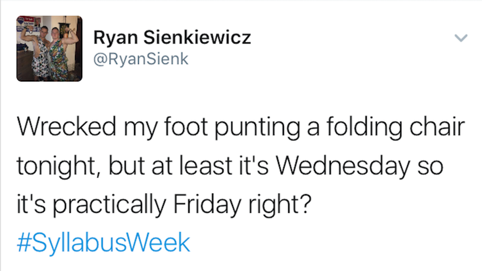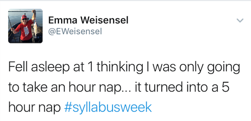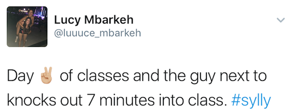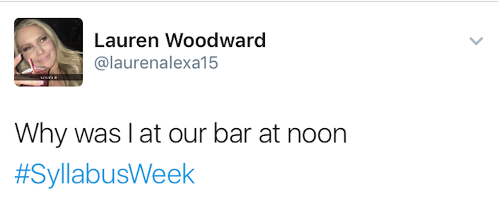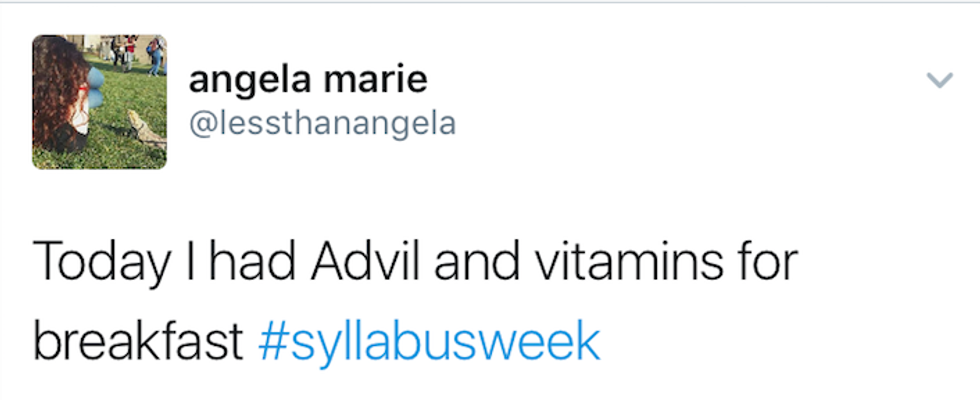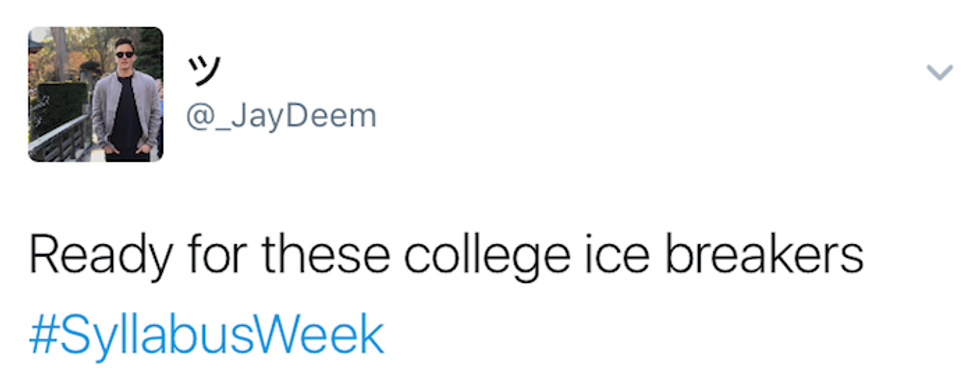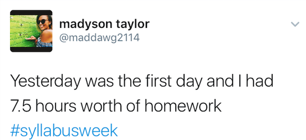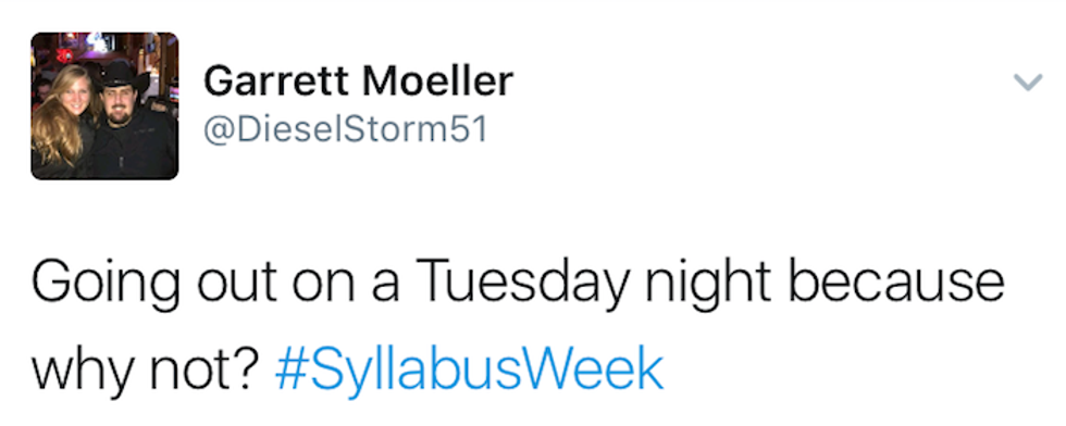 Syllabus week : When students begin a new semester, reading the syllabi from their new courses throughout the week, and if their professors hate them, actually assign work within the first couple of days. Most importantly, syllabus week is just a seven-day excuse to go out every night. No regrets, just a great time. Many people have shared their syllabus week moments on Twitter, and here are the ten best tweets I could find: