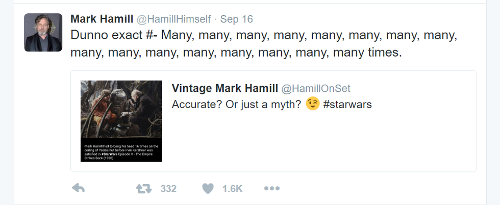 The picture reads "Mark Hamill had to bang his head 16 times on the ceiling of Yoda's hut before Irvin Kershner was satisfied in #StarWars Episode V - The Empire Strikes Back (1980)". And here I just thought it was an accident that had made it into the film.