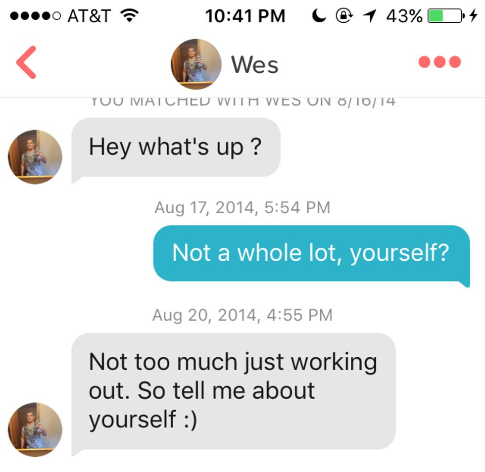 Strike one: Mirror pic. Strike two: Read my damn bio. Strike three: "working out" and Tindering? Still not impressed. Bye.