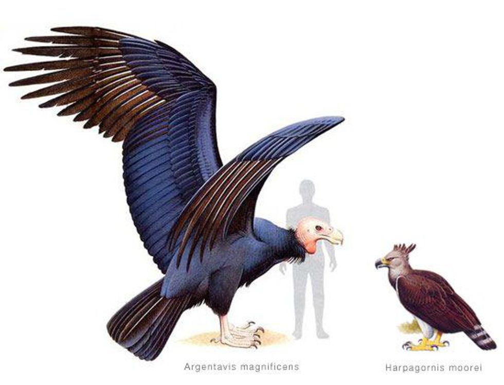 Haast's eagle was the largest eagle known to have ever existed. It lived in New Zealand and is believed to have gone extinct when its main food source, the moa, were driven to extinction. An individual of the species is depicted in one of the moa drawings above as well.