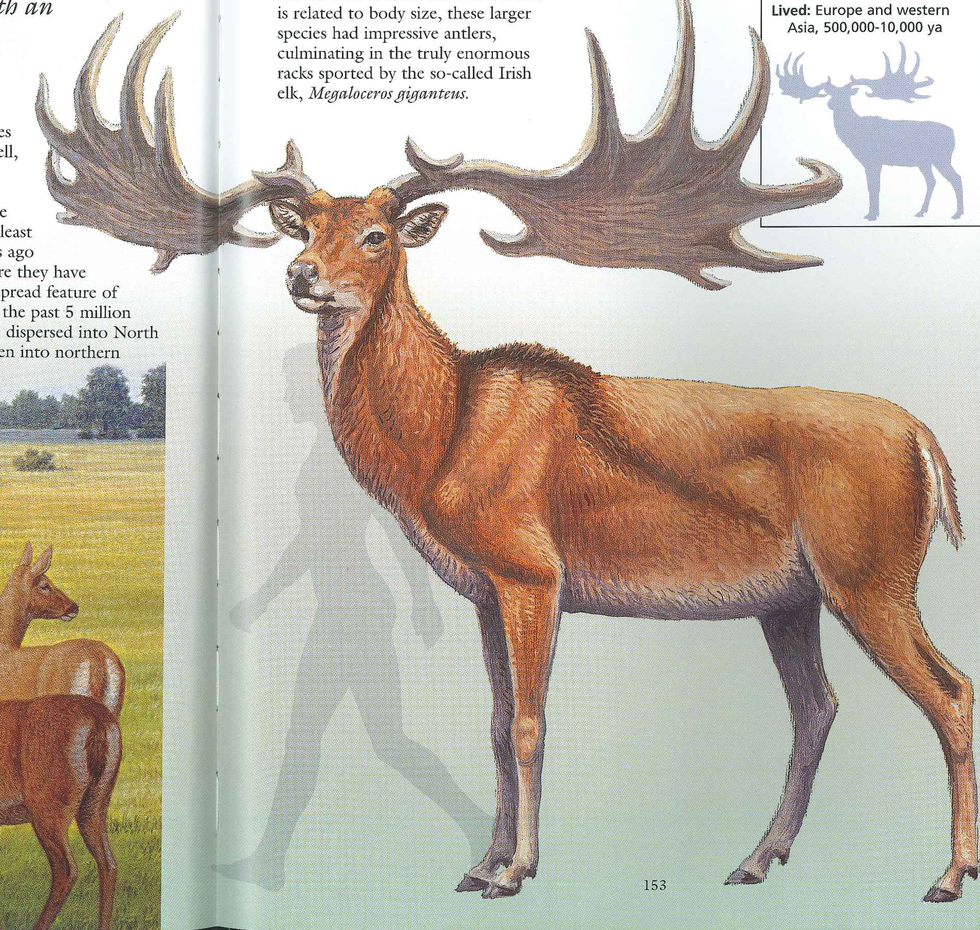 Megaloceros giganteus is one of the largest deer species to have ever existed. It lived in Eurasia and Africa. It was up to 2.1 m (6.9 ft) tall at the shoulders with its antlers weighing up to 40 kg (88 lb).