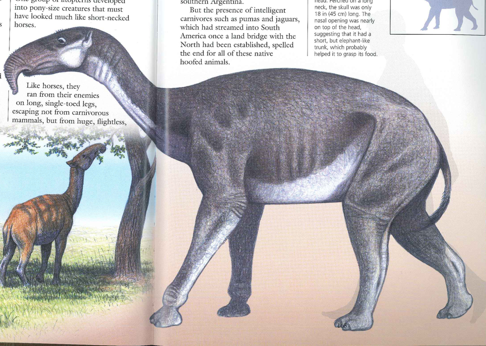Macrauchenia patachonica was a member of a genus of ungulates. It was a huge mammal living in South America and had a small trunk. Its name means "long llama".