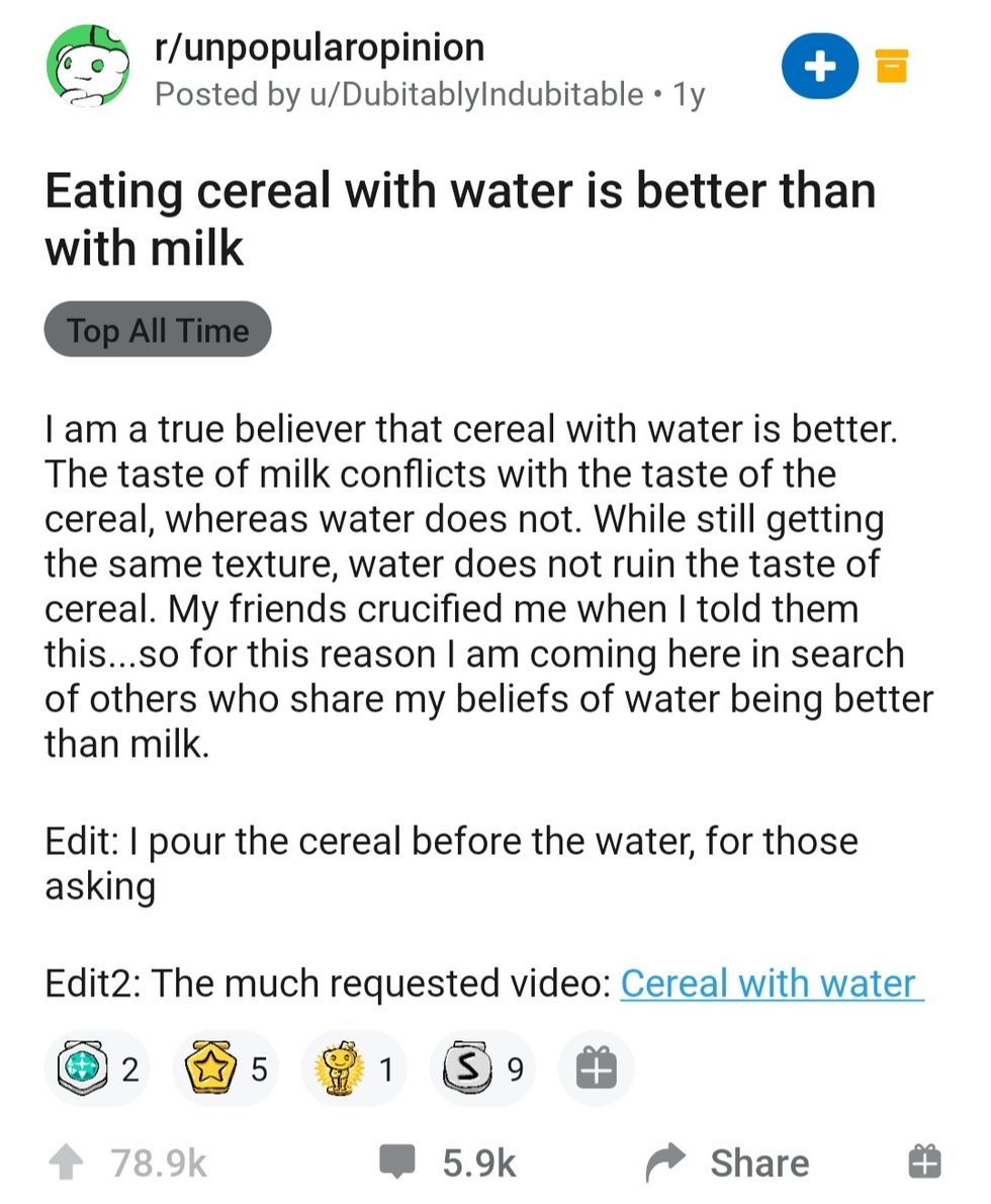 I gagged a bit just by reading this, but at least you put the cereal first. The user also put a video of cereal with water after being requesting one by another user in disbelief.