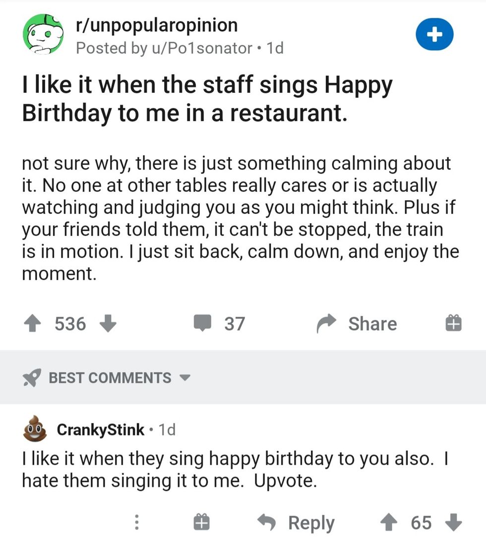 You see, extrovert or introvert, people typically feel awkward when a random group of staff sings Happy Birthday for a whole restaurant to hear. Sure, I'm getting a little dessert to celebrate my birthday, but how am I supposed to act in this situation? But since it makes you happy, good for you and enjoy! It's still an unpopular opinion, though.