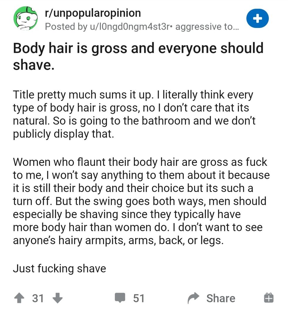 If hair disgusts you, I assume you also shave your head and eyebrows then (which is totally okay if someone chooses to shave those out of personal preference.) I think that the most unpopular part about this is that the user thinks that male body hair is also disgusting. Male body hair is typically seen as normal and manly. Despite the growing acceptance, female body hair is still widely seen as unacceptable.