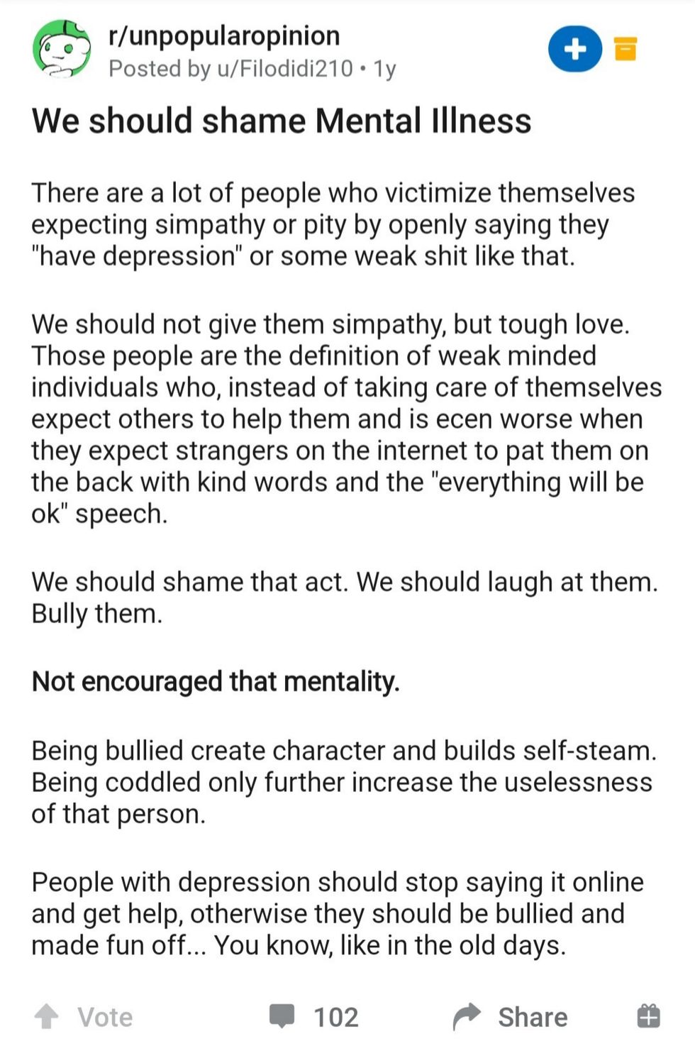 Basically, it says that instead of trying to help people, we should bully them out of their mental illness. While there are people who see mental illnesses as weakness (still quite a popular opinion), they don't blatantly agree that bullying is okay. With increasing awareness, bullying is frowned upon, mental illness or not.