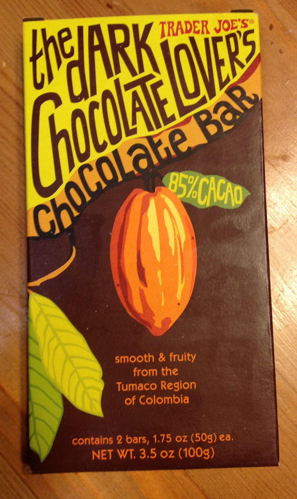 Trade Joe's 85% cacao dark chocolate bar tastes like chocolate should but without the overly sweet flavor. This bar is rich and will satisfy cravings for bold, yet rich chocolate.