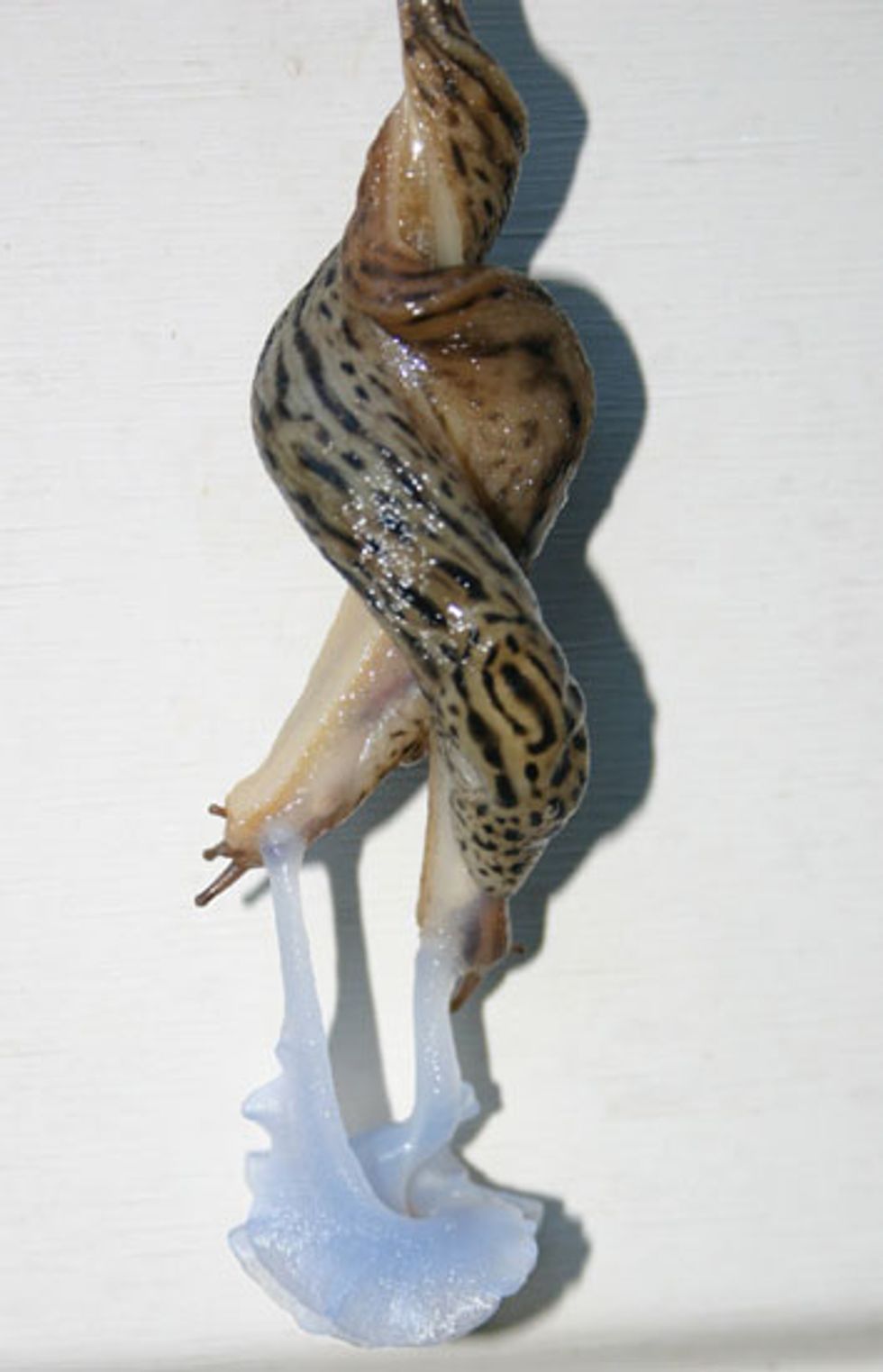 If someone ever gets to actually see intimacy between two leopard slugs, they probably wouldn’t even realize mating is going on. The mating usually occurs after dark so it is rarely seen by humans. When mating occurs the slug must hang upside down from a strip of mucus. Hanging upside down helps them extend their penises from their head openings. Their penises are as large as their bodies. Their excessive genital size is so they can wrap their penises around each other to fertilize the eggs. However, they can wrap themselves up in their penises too since they are hermaphrodites, so they can fertilizing on their own. In the case of feeling frisky, slugs will mate with other slugs. It's not really gross to see because you can't even tell what is going on. Just be fascinated by the pretty blue mucus that is kind of gross but also has a nice aesthetic.