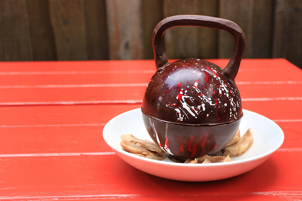 Finally, weight lifting you can do with a fork. Apparently, the owners of HG Sply Co. are totally into health, which explains why they would put a $25 cheesecake filled chocolate barbell on the menu (i'm assuming it's more for mental health than physical health).