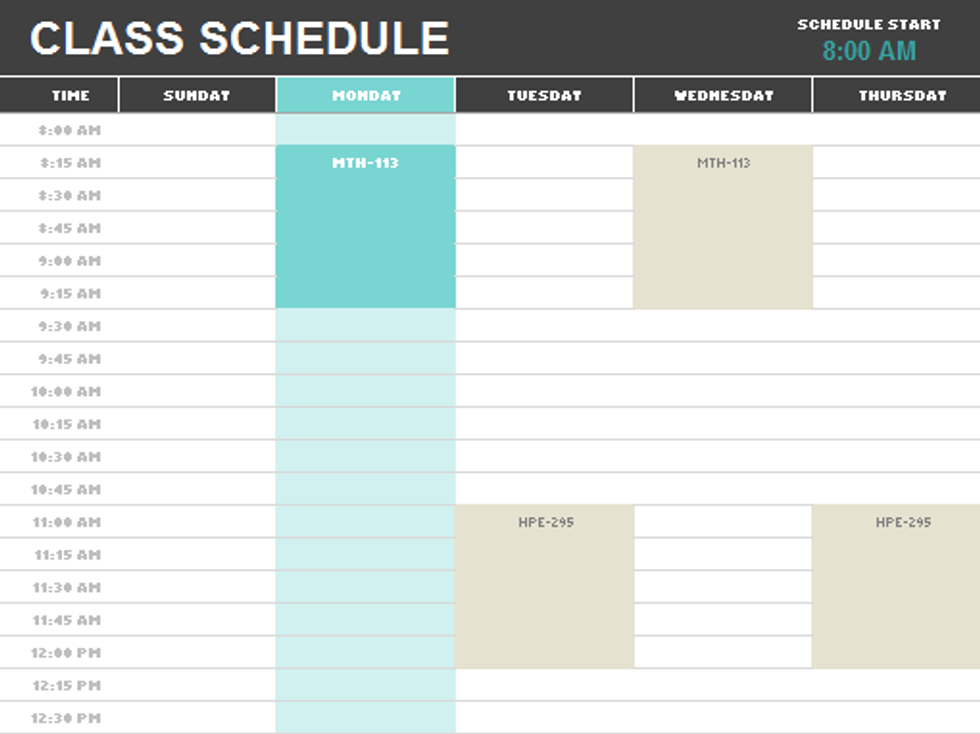 I cannot express this one enough. Yes, you can go on your student portal and look at your schedule. Most of the time, however, they are confusing and do not give all of the information that you need to successfully get to the right class. My advice to you, which I have already done this week, is to look on the university-given schedule and write/type your schedule out in a format that is easy for you to quickly comprehend and read. You do not want to be fumbling around trying to see what it means, when you were supposed to be in your next class 3 minutes ago! I write out my schedule in columns: Day, Time, Class, Location and Instructor. Below is another example that can be downloaded off of the Office website.