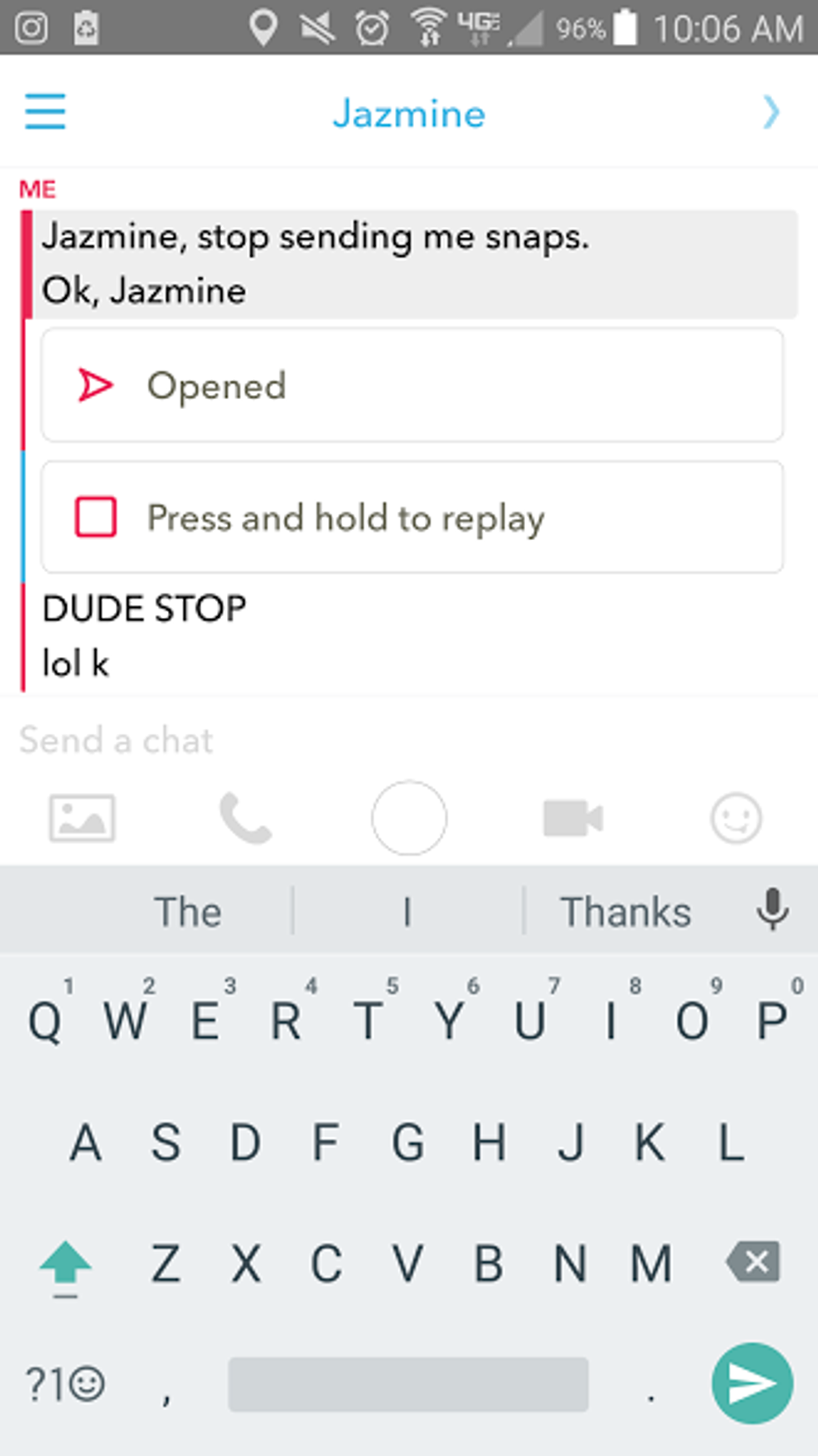 For some strange reason, this is an option on Snapchat. You can send snaps to yourself, which, in my opinion, is Snapchat simply inviting you to prank your best friend. Send her endless snaps of you (or of her, if she's in the same room as you), and send them all to her for her to find and open later.