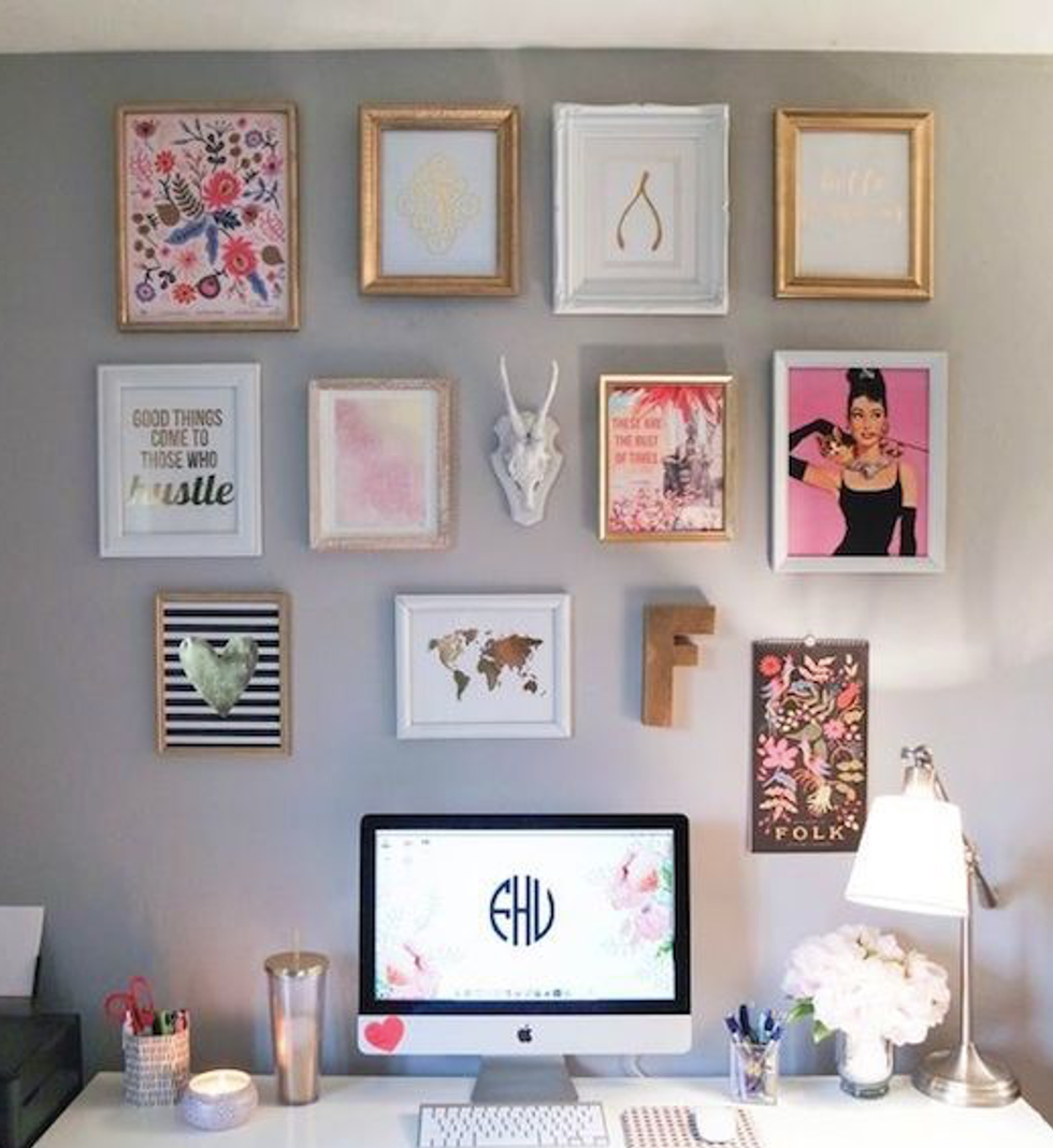 One way to cover the walls of your dorm is to make a gallery wall. You can either make a gallery wall with prints and saying or you can fill frames with pictures of friends and family. Arrange the frames on the wall and voila!