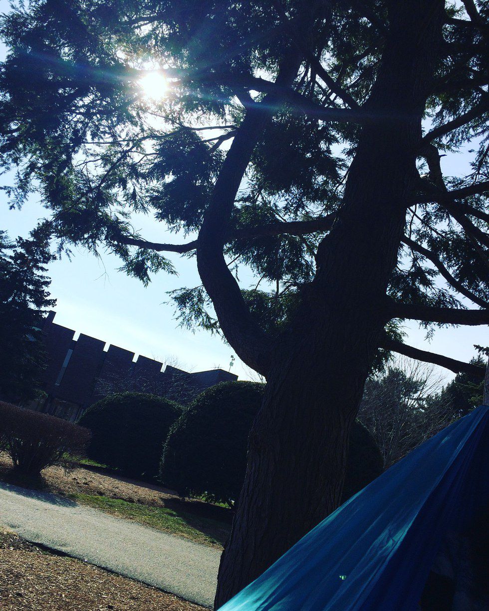 Being outdoors is so rejuvenating, even if you are studying. My friends and I bring hammocks outside our dorms, hang them up and pile in. We watch soccer games, people passing and talk with friends that question the safeness of the hammock rope-tying methods...
