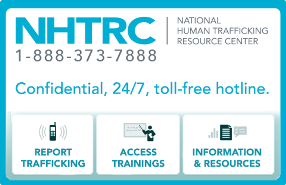 Keep the National Human Trafficking Resource Center ’s 24/7 confidential hotline handy. Saving this number in your contacts and using it whenever suspicious of having seen a victim of human trafficking is one of the easiest and most effective ways to aid law enforcement officials in uncovering exploitation, bringing traffickers to justice and victims to freedom and restoration.