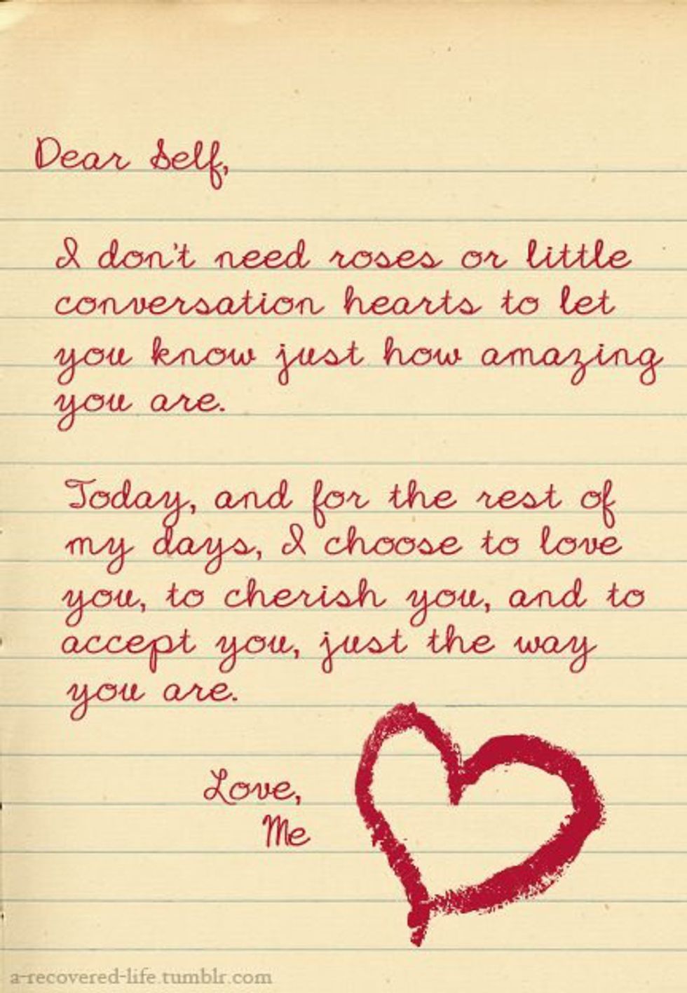 Valentine's Day is the day that every single person hates and dreads, and the day that single people know as "Single Awareness Day". Believe it or not, Valentine's day doesn't have to be an awful day for you if you are single, you just have to love yourself. Valentine's Day doesn't have to be just about loving a significant other, it can be about loving friends and family, but more importantly yourself. We spend so much time trying to make others happy and we don't spend enough time loving ourselves and making ourselves happy. This Valentine's Day make yourself your own bae, love yourself, do what makes you happy and treat yourself! After all, you must learn how to love yourself before you can love others!