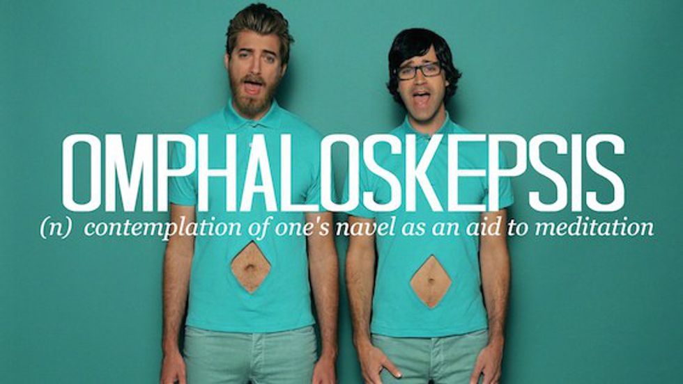[om-fuh-loh-skep-sis] : contemplation of one's navel as an aid to meditation.