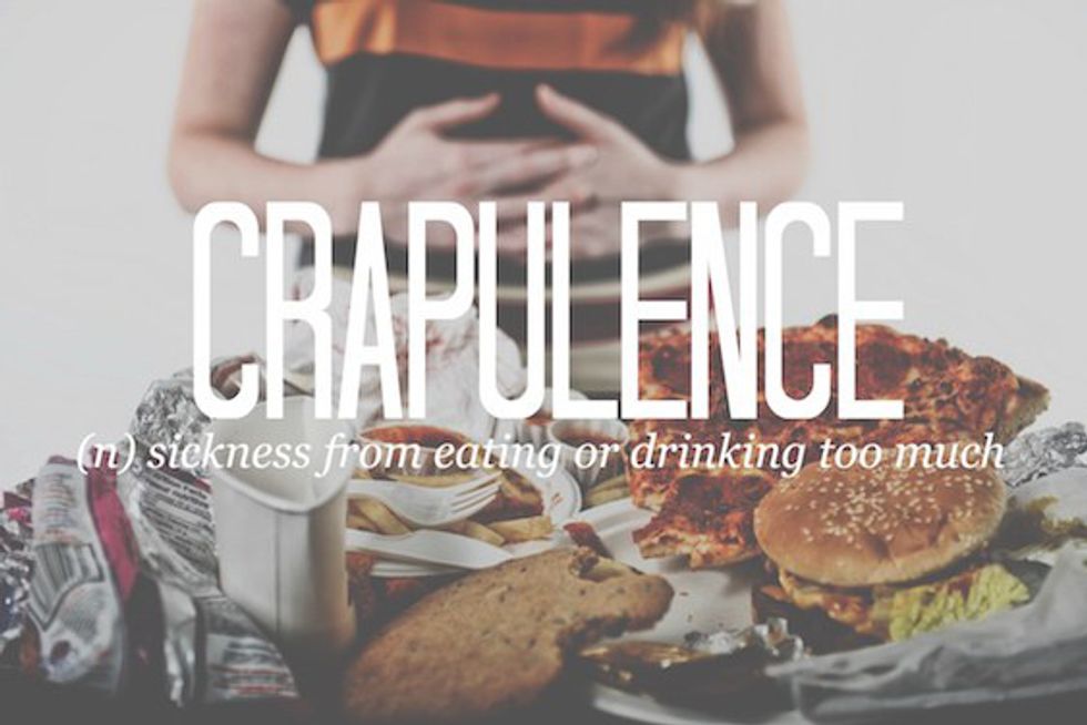 [krap-yuh-luhns] : sickness from eating or drinking too much.