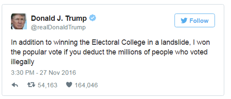 62. He is continuing to spread lies about the turnout of the election, claiming that millions of undocumented voters voted illegally (against him, of course)