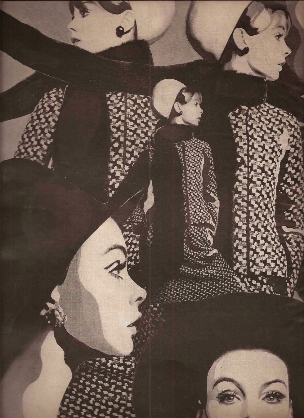 The retro-styles that shaped mid-sixties fashion included geometrics, cut-outs, back & white, vintage and pop-art & op-art. For example, crochet dresses were fashioned by those women brave enough. Also single large cut-outs were trending in in the front and back of dresses, along with go-go boots. Also introduced were fishnets and trouser suits.