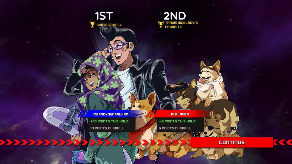 In length, 100ft Robot Golf is a fun, hilarious experience that will cater to robot enthusiasts and arcade aficionados alike. The big draw of the game is it's campaign mode, which is presented like a fan translation/dub of an anime, to the point where the opening cut-scene has a dubbing tag. The story itself revolves around an attempt to recreate the Robot Golf league after the previous one somehow managed to destroy the moon. It's something that doesn't take itself seriously and is all the better for it. Throughout the campaign you play as a cast of colorful characters like the Beyonce-inspired villainess Vahni, Aveline and Uncle who pilot a robot in a manner reminiscent of Pacific Rim, and Project C: a Voltron/Megazord styled robot that is piloted by a group of five Corgis. There is even a guest star: Pierce Washington from the Saints Row franchise, who is treated with as much respect as he is in his home series (read: not that much). Presentation-wise, the game has a character that will appeal to every type of player. If you're an anime fan and the term "instrumentality" means something to you, it's definitely worth checking at least the campaign out.