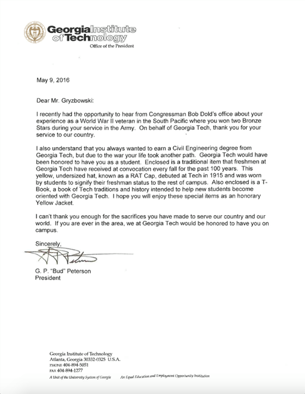 “Georgia Tech would have been honored to have you as a student,” Peterson says in the letter. “I can’t thank you enough for the sacrifices you have made to serve our country and our world.”