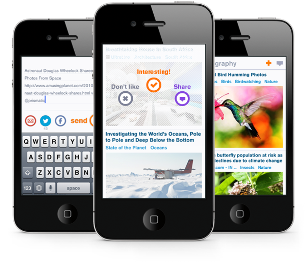 This app is the home for all your interests. You select your interests and topics and Prismatic will curate and find stories based on the popularity of the post. You can comment on stories, talk with friends and share the articles via Twitter and Facebook.