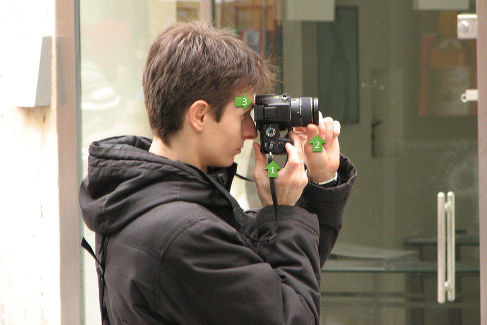 La probabilidad de que tus fotos salgan movidas aumenta si la cámara es sujetada de un modo incorrecto. Para evitar que las vibraciones de la mano al tomar la foto arruinen las fotografías es importante mantener la cámara lo más fija posible. Una manera común de hacer esto es utilizando la mano izquierda para sostener el lente por debajo y la mano derecha para detener la cámara. La frente se puede utilizar como el tercer punto para que la cámara se mueva lo menos posible.