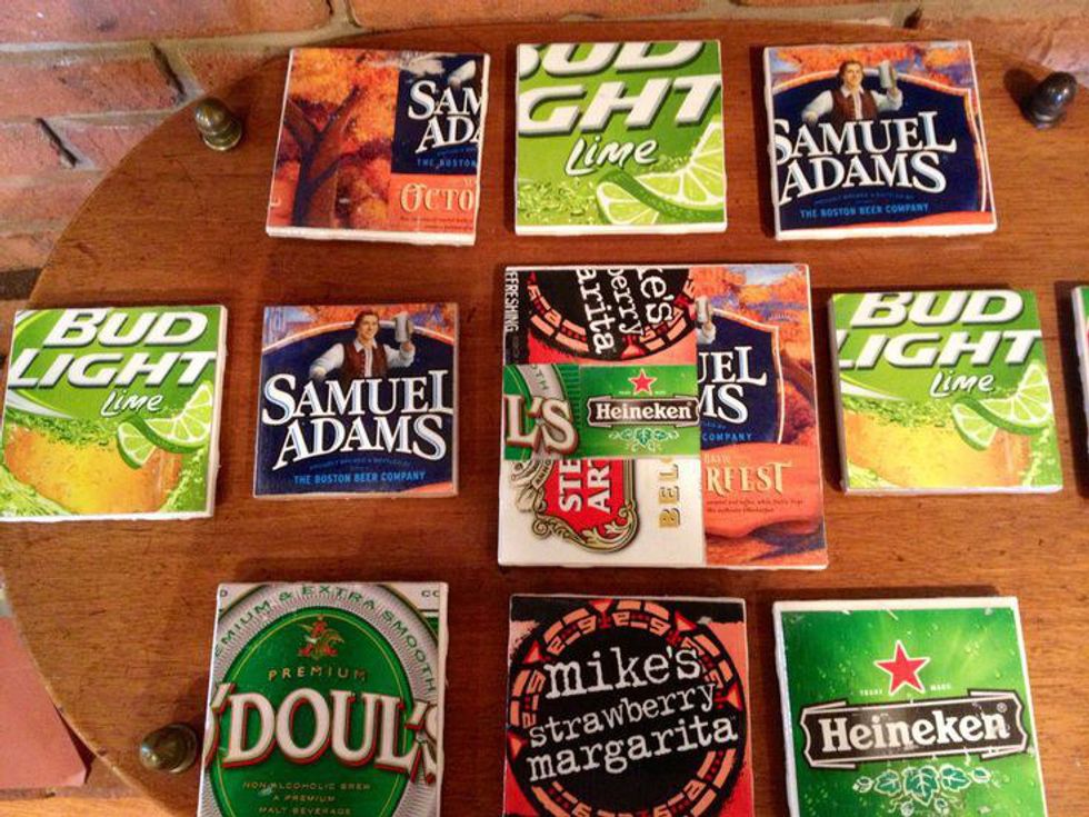 This gift is crafty and one of the cheapest. The supplies are: tiles, beer cardboard holders, mod podge, scissors and hi-gloss sealant. The tiles are only 16 cents at any hardware store. You can also enjoy the six pack of beer while crafting.