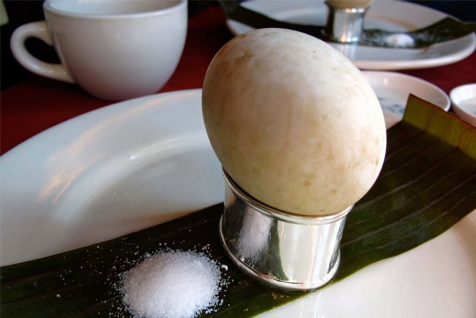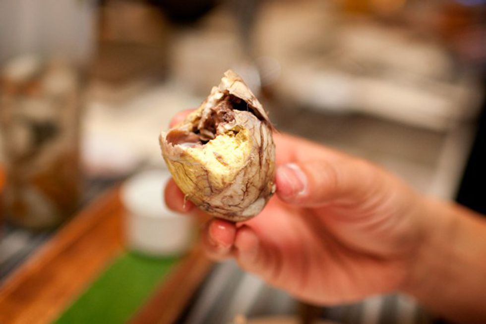 Ah, this was so unassuming from the first photo -- this is balut, a fertilized duck embryo (omg). It is a popular Filipino street food and it comes complete with little duck feathers and bones. Yum.