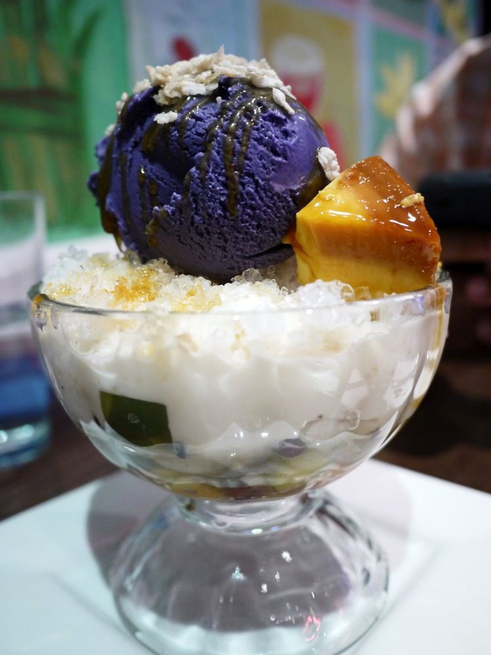 This interesting looking dessert is a traditional Filipino dessert with shaved ice, evaporated milk, boiled sweet beans, jello, and fruits. The purple ice cream is purple yam ice cream (sounds weird but it's delicious, take it from me!) and the jelly-ish looking yellow slice is flan.