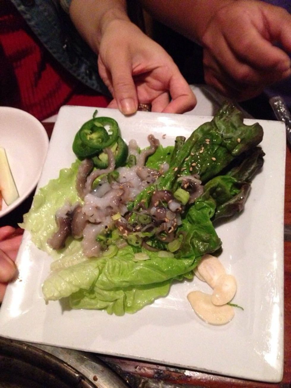 You can't tell, but that cut up octopus is still wriggling on the plate. You eat it live, which seems slimy and gross to me but people love it for the experience so, hey, whatever floats your boat. Maybe I'll become ambitious enough to try it one day.