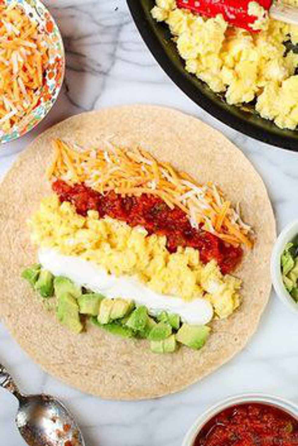 Getting omelettes and fried eggs every day can get bland and boring. Spice up your morning by putting scrambled eggs into a tortilla and adding your own toppings such as cheese, veggies, and bacon bits.