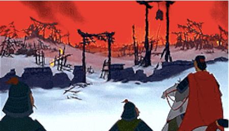 The father-son connection between General Li and Li Shang, though it seems stiff, still shows a true familial bond. As Li Shang and his fellow warriors come upon the burned ruins of a village, it isn’t just the debris that pulls at the heartstrings. Near the edge of the village, half covered in snow is the helmet of General Li. Grief struck his son takes his sword, plunges it into the snow banks and places the helmet just on the handle protruding from the ground- as a sort of memorial- and walks away in silence. Though Li Shang buries his emotions to seem strong and level-headed to the men under his authority, the sadness is palpable.