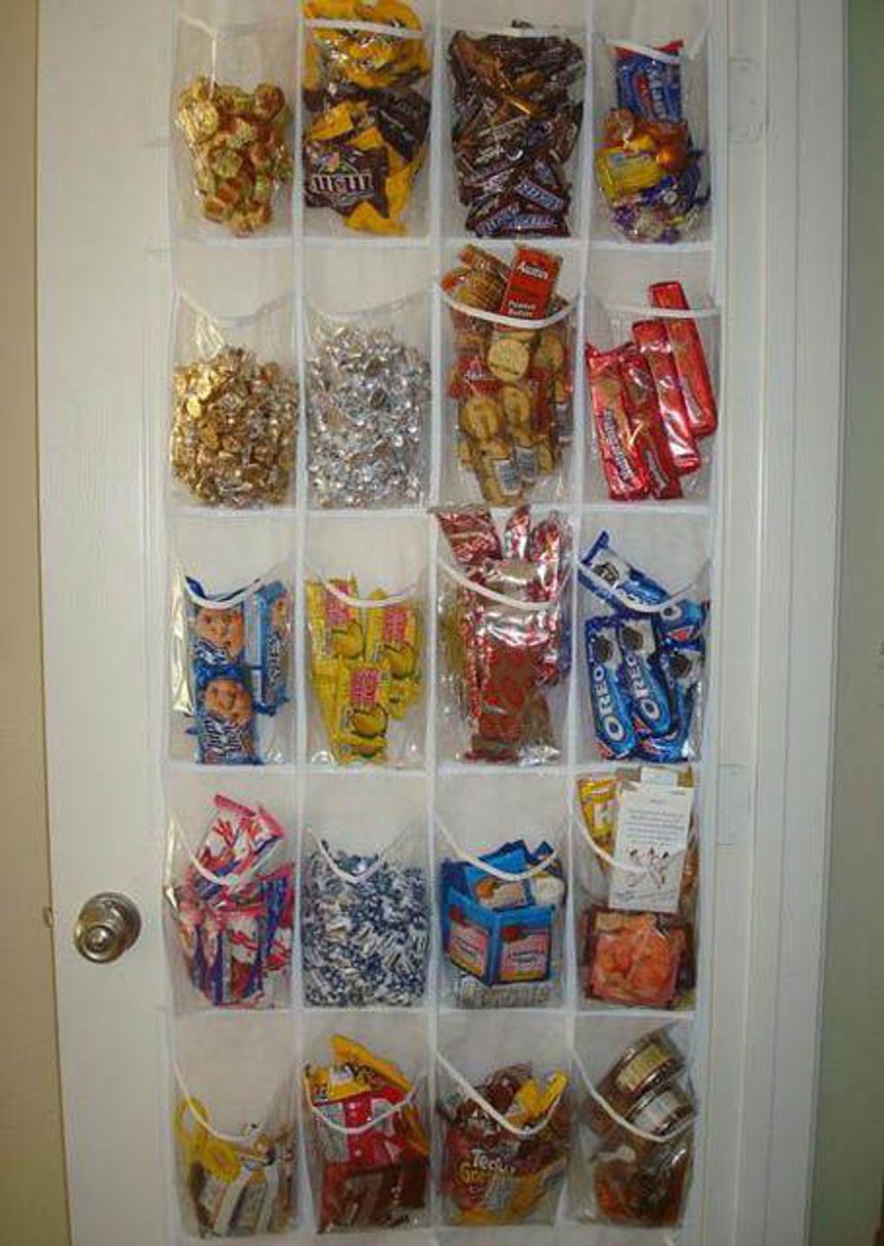 If you have a door that you're not putting your mirror on, hang a plastic shoe rack and fill it with snacks. This will make it easy to grab a snack before you head to class.