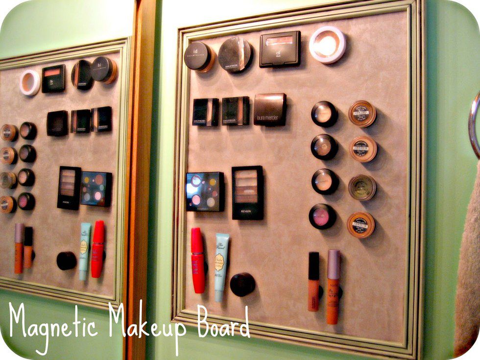 Hanging a magnetic strip or frame creates a place for hair clips, make up tools, and other bathroom necessities.