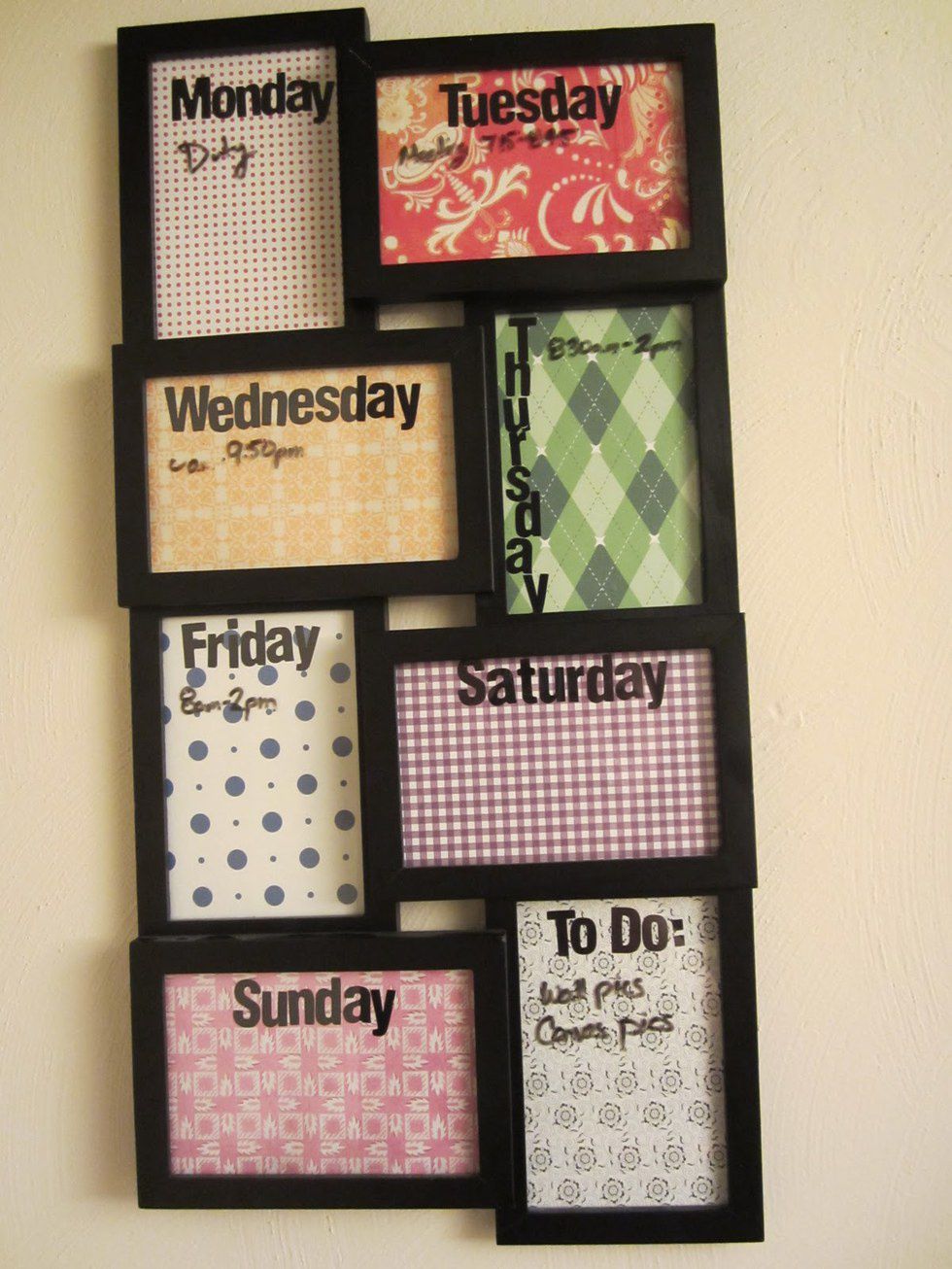 Hang a picture frame set with your favorite designs inside and label them the days of the week. Then write on the top glass what you need to accomplish on each day.