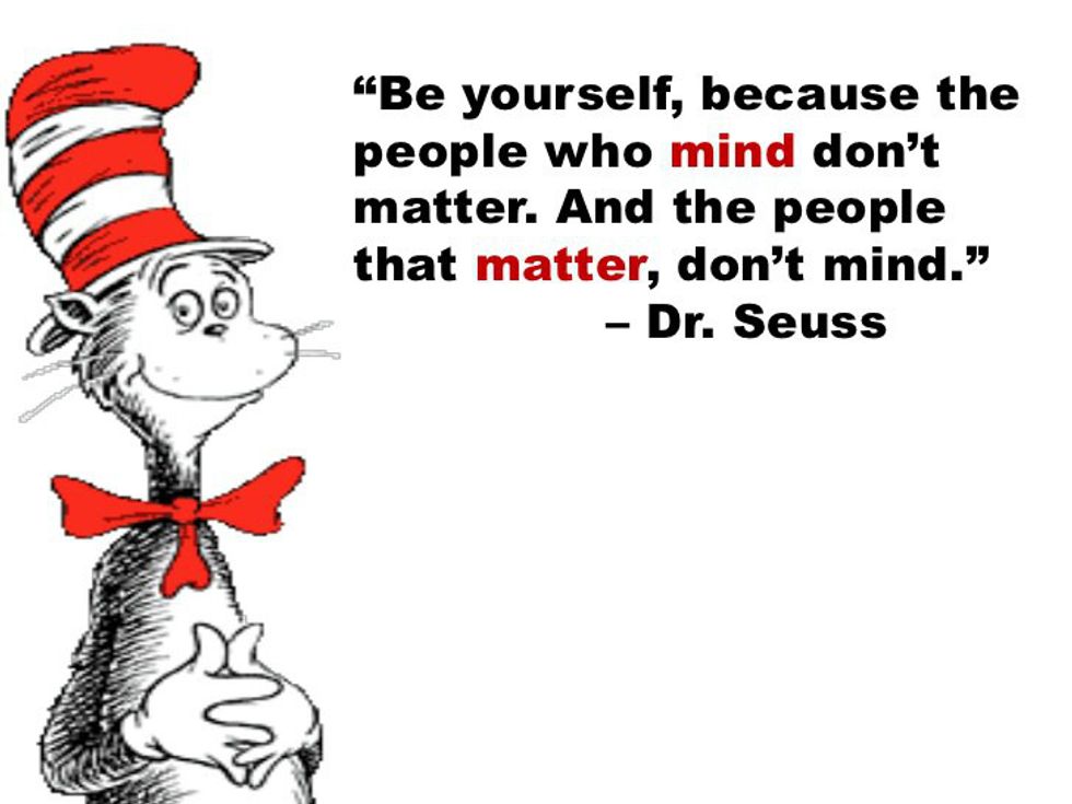 We are constantly struggling with ourselves whether it's trying to find ourselves, feeling comfortable with ourselves. We are constantly at war with ourselves. In this time in our lives, we start to become more comfortable with who we are. Dr. Seuss knows there is only one of us, so we might as well love it!