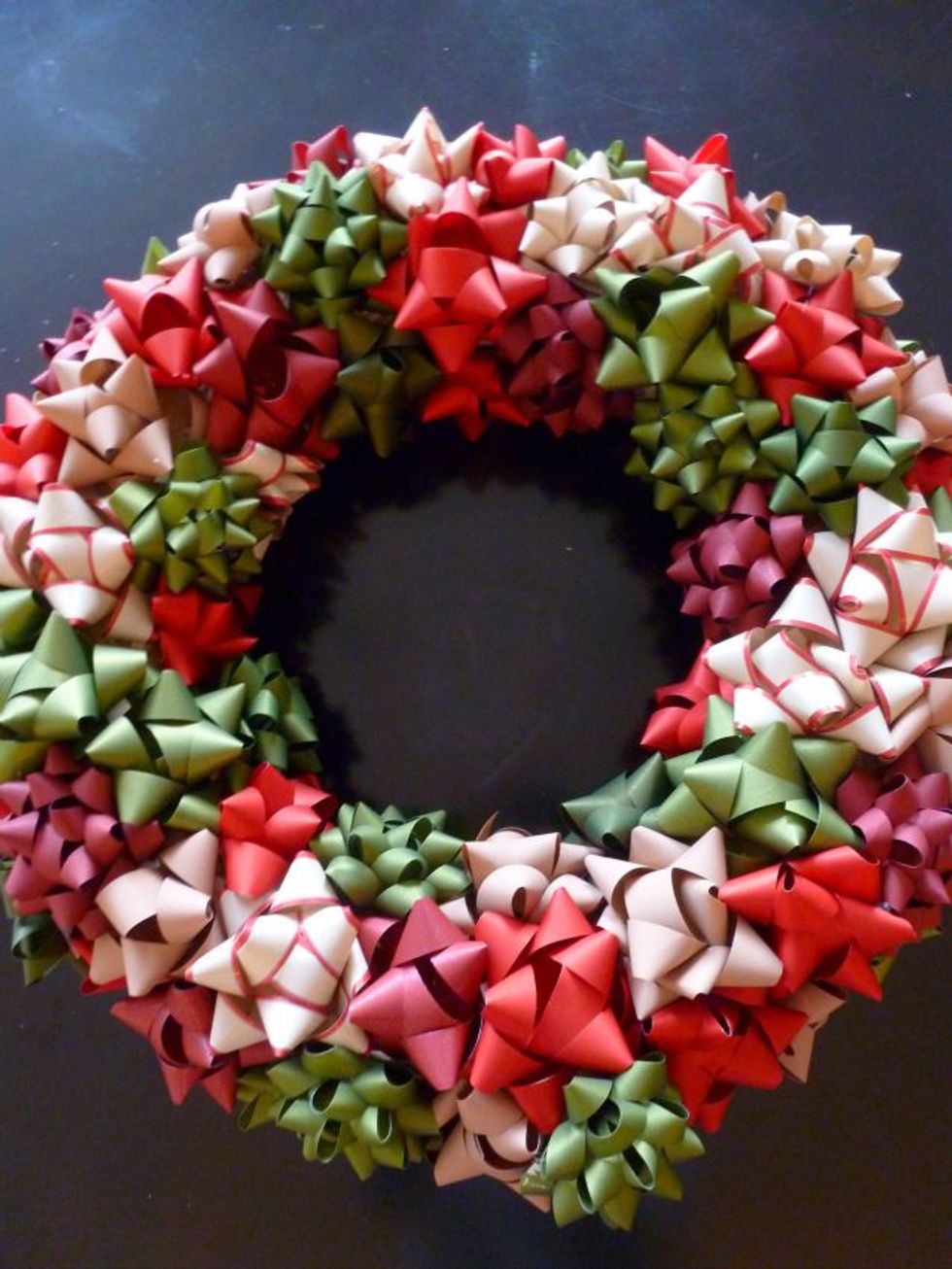Surprisingly, the dollar store has a incredible decoration selection, including wreaths. But if you can't find one you like there, make your own! Buy a styrofoam ring at Michael's and then glue on anything Christmas-y, like the bows on this one.