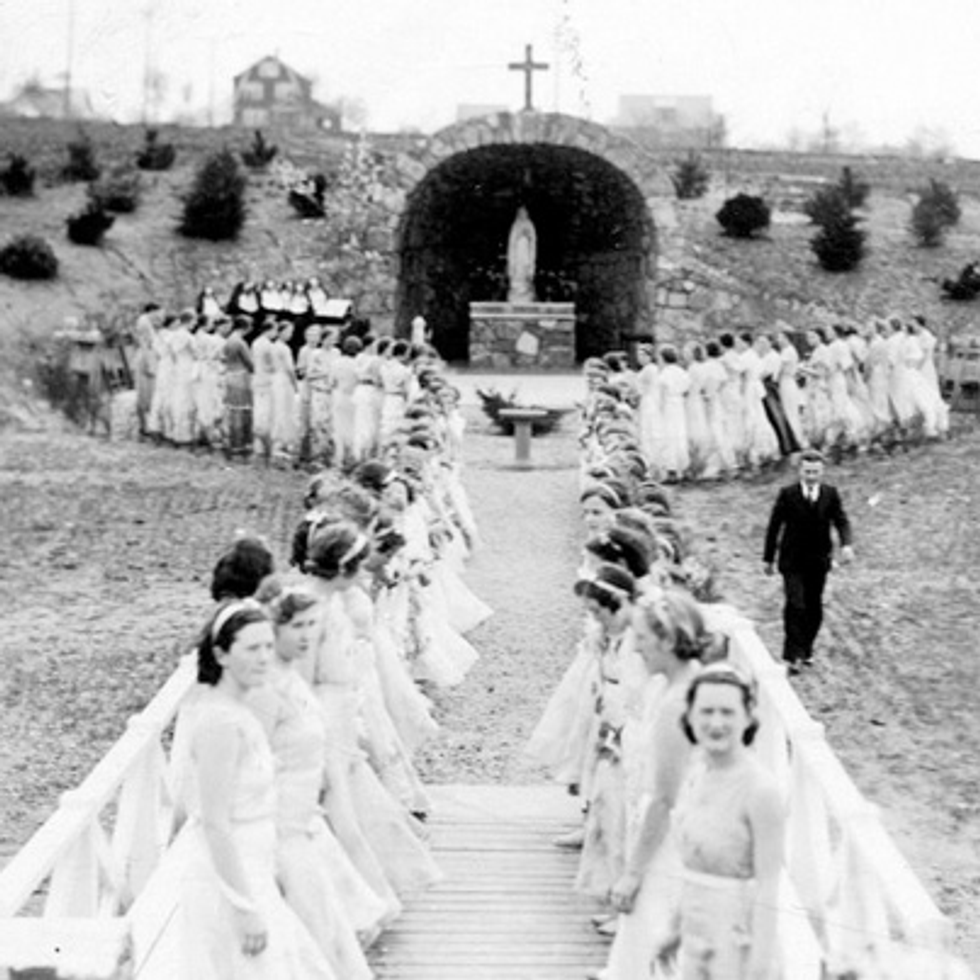 This legend surrounds the love story of Dorothy and Tom. Dorothy attended Mercyhurst college in 1941 when Tom proposed to her. However, before their relationship could continue, Tom was sent off to war. Within days of their scheduled wedding, Dorothy was informed of Tom's death. Completely devastated, Dorothy turned to the church and became a nun with the Sisters of Mercy. To move on with her life she placed her engagement ring on the fingers of the statue of Baby Jesus in between the Christ the King’s Chapel and the Queens Chapel. However, when the war ended in 1945 Tom came to visit her. While Dorothy was overwhelmed with joy, having to choose between a life with God and a life with Tom was too much for her. She went into her room above the chapel and hung herself, leaving behind her ring on the baby Jesus statue. To this day people claim to see her wandering around, still unable to make a decision on who she wants to be with.