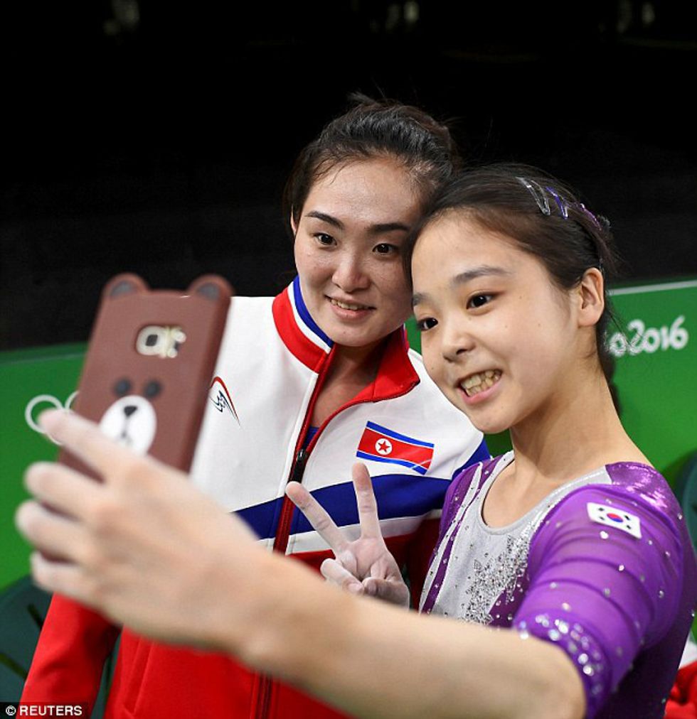 Muhammad is the first U.S. Olympian to compete in a Hijab. Way to defy stereotypes and prove women can do anything!9. North and South Korean Gymnasts snap a selfie together.