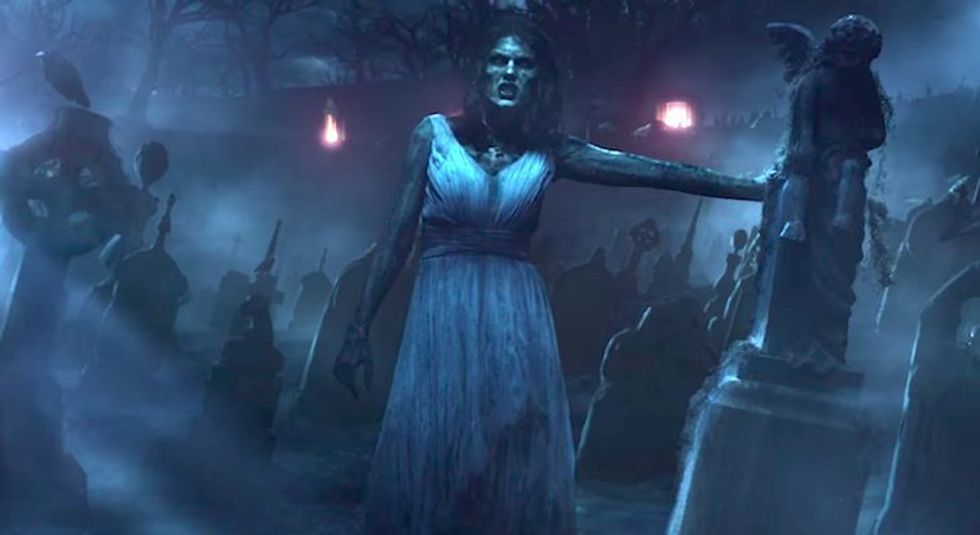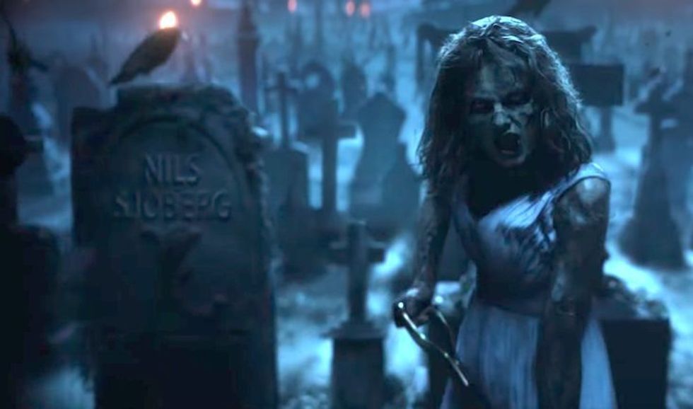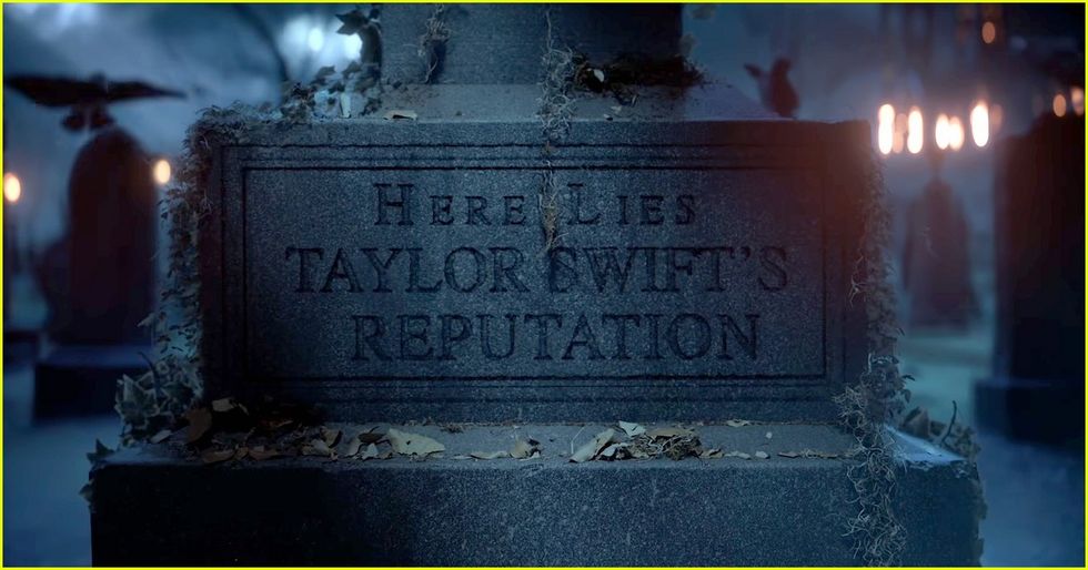 The opening scene of the music video is a graveyard with a tombstone that reads "Here lies Taylor Swift's reputation" and that is the first sign that she is coming out swinging.