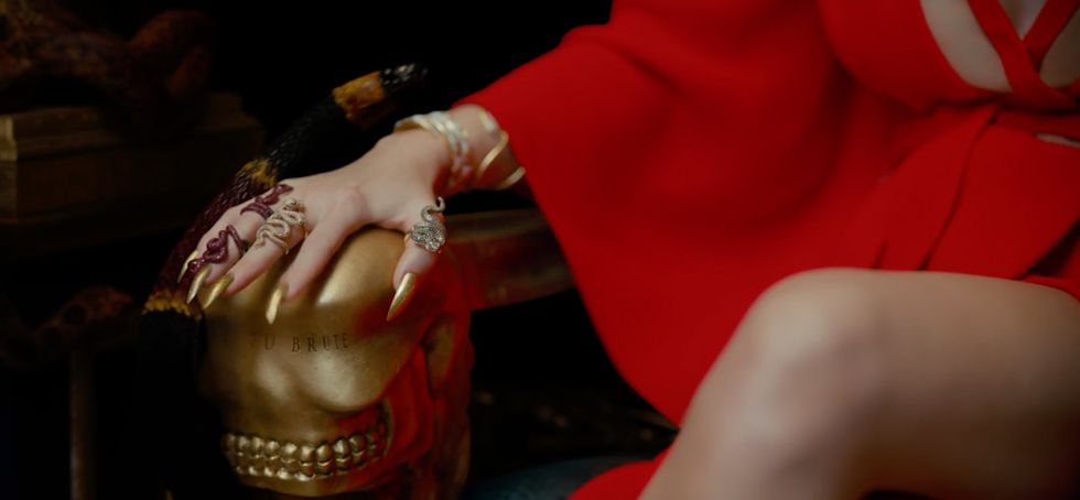 Pretty clear symbolism here with the snakes and the tea. With her recent drama surrounding Kanye West and Kim Kardashians fans spamming her with snake emojis, it's clear she is referencing this situation and serving the "tea" (this one is for Kendall Jenner). She even went as far as having a snake tattoo on her leg in the scene where she swinging in the birdcage.