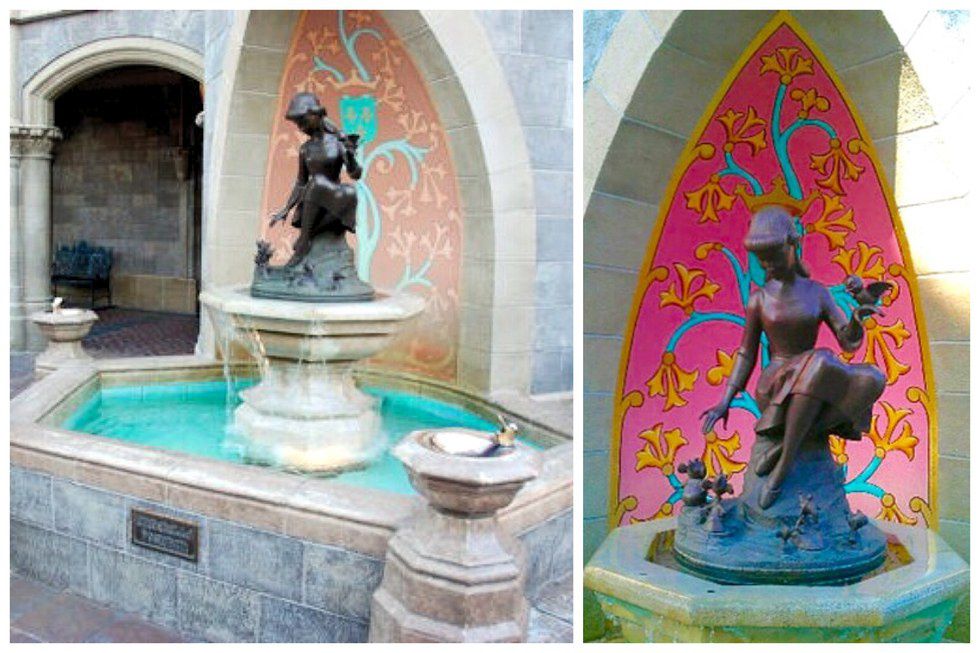 Just behind Cinderella's Castle, you'll find the princess' fountain. While the fountain itself is beautifully designed, you get a tiny little surprise if you alter your perspective. Look at Cinderella's head dead on, and you'll see the design on the wall behind the fountain appear to crown her head.