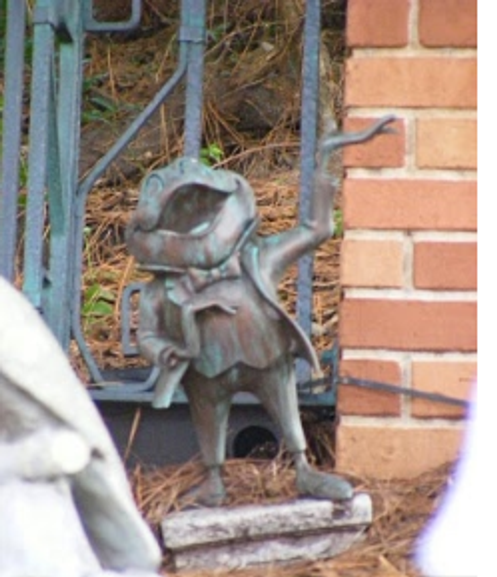 You can also find Mr. Toad after you exit The Haunted Mansion attraction, in a little pet graveyard, in the very back. The epitaph isn't exactly visible to guests, but it's rumored to say "Dear Mr. Toad, It's sad but true. Not nearly as popular as Winnie the Pooh."